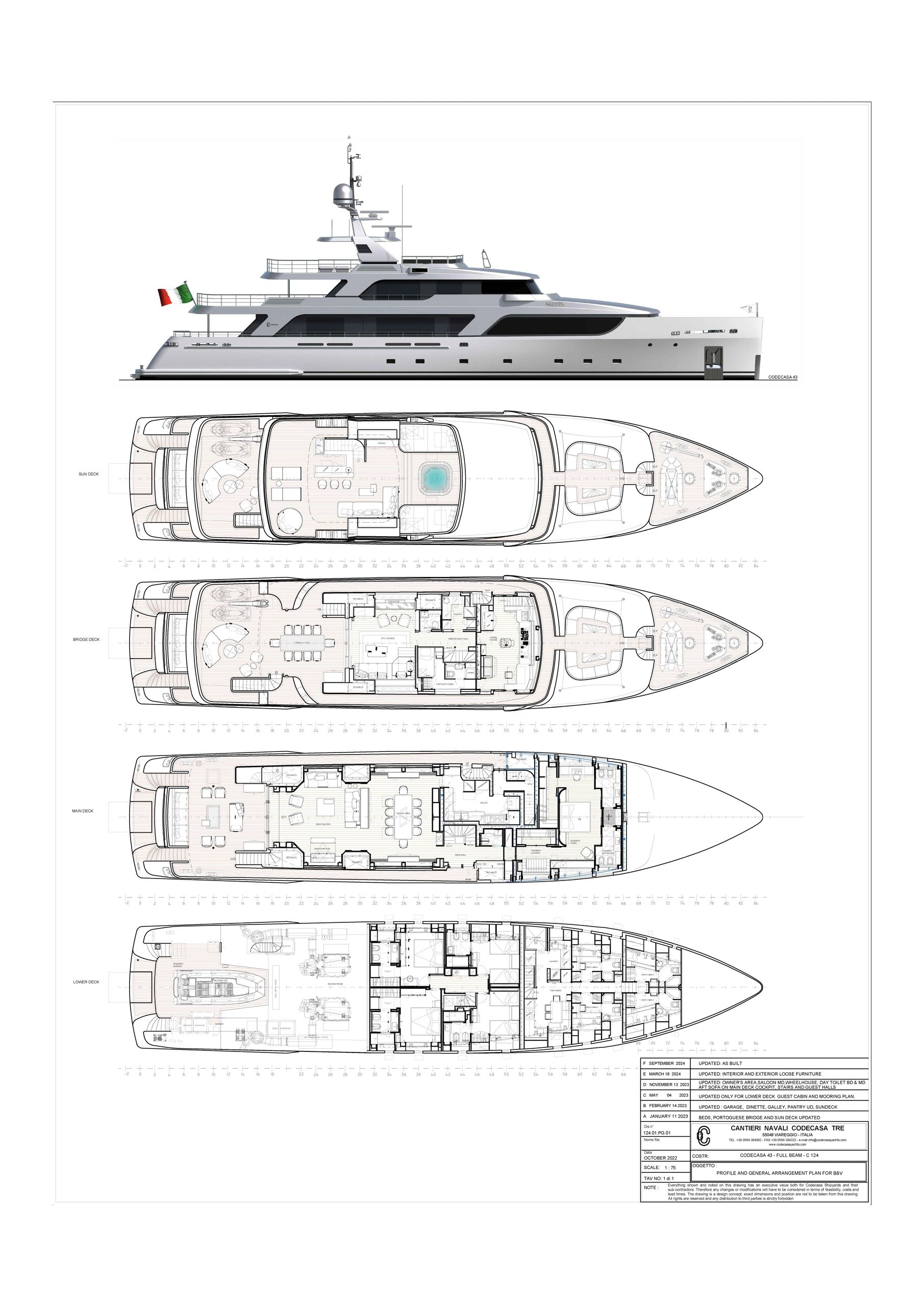 • On deck full 24’ 8” beam master stateroom, along with four additional lower deck staterooms.
